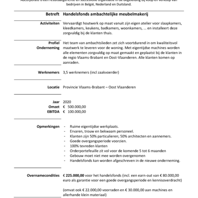 - Ruime eigentijdse werkplaats. - Ervaren, trouw en bekwaam personeel. - Klanten zijn 50% particulieren; 50% architecten en aannemers. - Goede overgangsperiode voorzien. - 100% tevreden klanten - Orderportefeuille zit vol voor de komende 5 tot 6 maanden - Gebouw moet niet mee worden overgenomen - Handelsfonds kan worden afgeschreven.